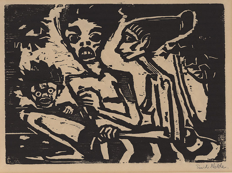 Emil Nolde... Familie (1917, woodcut, Signed in pencil lower right. Titled in the lower left corner by Ada Nolde. According to Noldes notes one of 16 impressions. On firm sturdy paper. Reference: Schiefler/Mosel 128 II). From the exhibition Native Visions: Tribal Influence in German Expressionist Prints at Pace Master Prints and Pace Primitive in New York, NY.