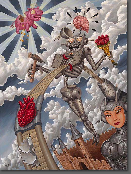 The Amazing Pooch... Corazon Coaster (2006, Acrylic on masonite). From Pooch Island - works by The Amazing Pooch. "...Raised on a diet of Ray Harryhausen films, H. P. Lovecraft novels, comics, Walt Disney World and other Florida tourist traps, Pooch paints images that seem to exist in a bizarre afterlife. His art is a visual cocktail of these influences—with a shot of lowbrow culture—shaken and stirred, then served up in a souvenir tiki skull on the Day of the Dead. A self-taught artist, he owes much of his painting skills to over ten years of daily tattooing and drawing."