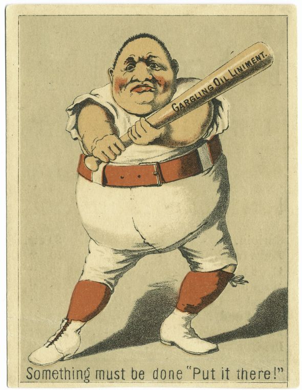 Gargling Oil Liniment Baseball Card. From America's National Game: The Albert G. Spalding Collection of Early Baseball Photographs at the NYPL Digital Gallery. "...Over 500 photographs, prints, drawings, caricatures, and printed illustrations from the personal collection of materials related to baseball and other sports gathered by the early baseball player and sporting-goods tycoon A. G. Spalding. This collection includes 19th-century studio portraits of players and teams of the day, rare images, photographs, and original drawings."