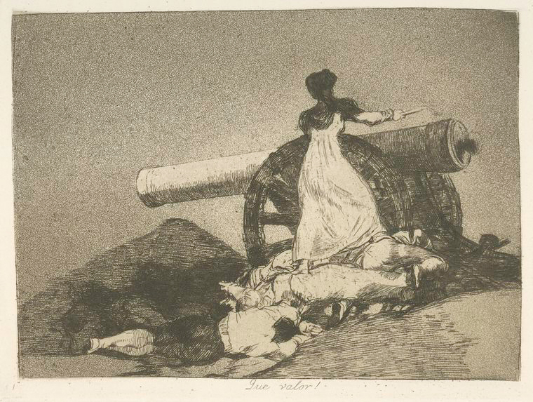 Francisco Goya... Que valor! (etching, from Los desastres de la guerra, published 1863, created 1810-1820). From Los desastres de la guerra (The Disasters of War). Also... Unpublished plates from Los desastres de la guerra. Part of the Samuel Putnam Avery Print Collection and Related Works at the NYPL Digital Gallery. "...Nearly 1,100 etchings, lithographs, and some drawings, by prominent 19th-century printmakers. Most of these works are part of the S.P. Avery Collection, complemented by holdings found in the general Print Collection. Together they represent the Print Collection's complete holdings of Félix Bracquemond, Félix Buhot, Francisco Goya, Charles Jacque, Edouard Manet, Charles Méryon, and Camille Pissarro."