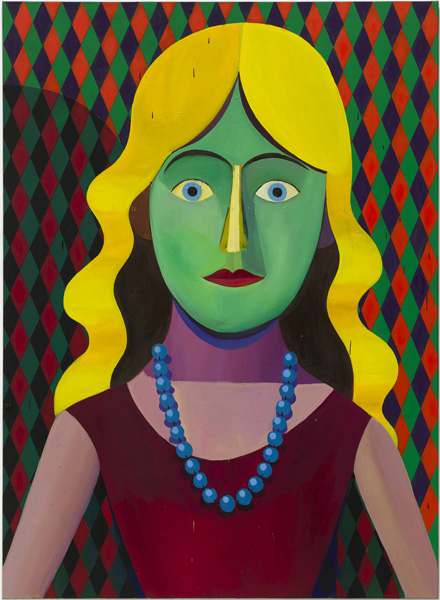Christoph Ruckhäberle... Grosse Dame (Large Lady, 2007, Oil on canvas). From the exhibiton Christoph Ruckhäberle: Falsche Figuration at Galleri Nicolai Wallner in Copenhagen, Denmark. "...Ruckhäberle's work represents a compositional jigsaw puzzle, each element an individually delineated shape filling a gap in the whole: L-shaped knees disjointedly connected to trapeze skirts, and tubular arms and legs unite square bodies - the individual elements locked together without a sense of grounded order. A rhythmic pattern of triangles between the juxtaposed limbs gives form and movement to the figures. This space in-between sums up a classic painterly paradox, how solid mass is only made possible by absence."