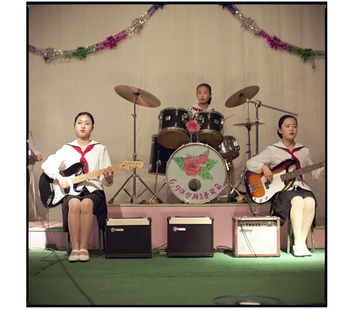 Hiroshi Watanabe... Music Band, Pyongyang School, North Korea (2007, Pigment Print). From Hiroshi Watanabe: Portfolio 6 - Ideology at Meter Gallery. "...'The news about North Korea was all negative,' Hiroshi Watanabe says. 'I thought...there have to be different stories there.' And so he set out to find a different angle on North Korea than its frequent depiction by the media as a nation of oppressed people. What he found was a quiet vibrancy; two lines of schoolgirls scowl in red scarves, a young violinist in a canary-yellow Hanbok calmly appraises the viewer, and a boy soldier smiles bashfully under his exuberant salute."